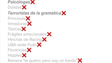 Así, quedaron eliminadas de las posibles candidatas las “kirchneristas, psicólogas, dolidas, terroristas de la gramática, princesas, inmaduras, tóxicas, frágiles emocionales e hinchas de Racing”. También aquellas que cursen sus estudios en la Facultad de Filosofía y Letras de la Universidad de Buenos Aires (UBA), se llamen Florencia o tengan una remera que diga “te quiero pero soy un bardo”.