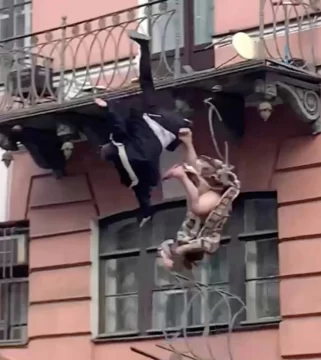 Una pareja de la ciudad de San Petersburgo, en Rusia, se cayó de un balcón a casi 8 metros de altura e increíblemente sobrevivieron al impacto. El insólito hecho fue filmado por un turista que grababa la zona histórica de la ciudad.