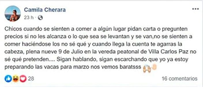 Camila Cherara, quien en sus redes se presenta como una de las dueñas del bar y eso coincide con el apellido del propietario que figura en la cuenta, respondió a la crítica del grupo de amigos.
