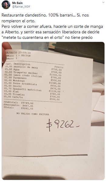 “Restaurante clandestino, 100% barrani… Sí, nos rompieron el orto. Pero volver a comer afuera, hacerle un corte de manga a Alberto, y sentir esa sensación liberadora de decirle “metete tu cuarentena en el orto” no tiene precio”, escribió en referencia a la prohibición de apertura de restaurantes dictada por el Gobierno Nacional en el marco de la cuarentena.
