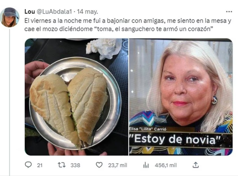Junto al mensaje compartió la foto del sándwich de milanesa en forma de corazón junto al meme de Lilita Carrió en el programa de Mirtha Legrand cuando dice: “Estoy de novia”. En cuestión de horas, la joven recibió más de 23 mil “me gusta” y cientos de respuestas.