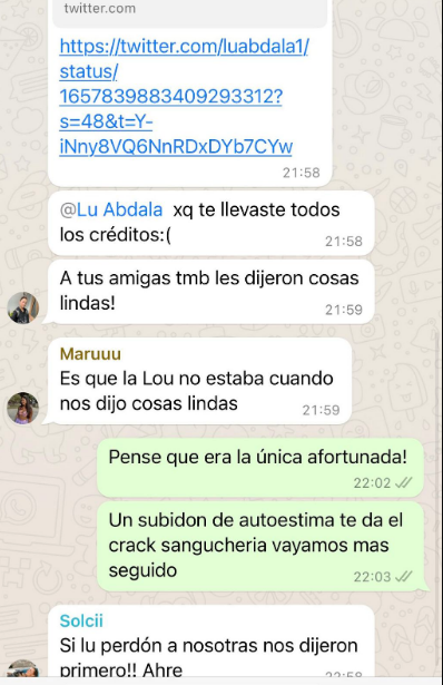 Ante esta situación, @LuAbdala1 compartió la captura con la descripción: “Al final jugó a mil puntas el sanguchero, chicos ven ya no se puede confiar en nadie”. “Bue re pincha globo tus amigas, qué les pasaba”, fue una de las respuestas que recibió de los usuarios.