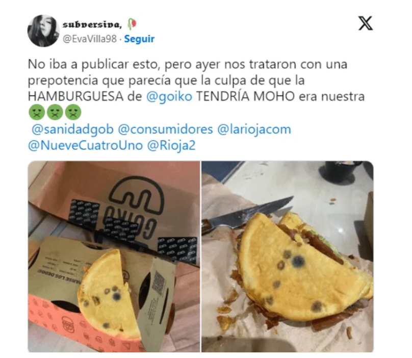 En la red socia X, antigua Twitter, una chica que fue a Goiko se llevó una nefasta sorpresa. El pan de su hamburguesa estaba en mal estado, recubierto de moho. Algo que según ella "no iba a publicar", pero no solo el estado de la comida fue el detonante de esta queja.