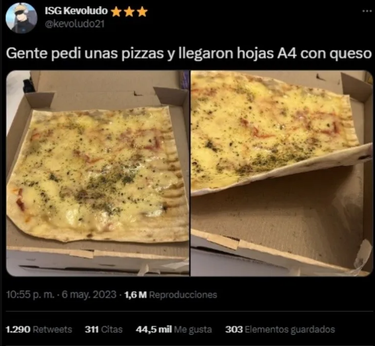El usuario en cuestión es “kevoludo21”, quien compartió una serie de fotos de las pizzas que le llegaron y describió: “Gente, pedí unas pizzas y llegaron hojas A4 con queso”.