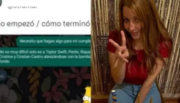"Necesito que hagas algo para mi cumple: no es muy difícil, sólo es a Taylor Swift, Perón, Riquelme, Evita, Cristina,y Cristian Castro abrazándose con La Bombonera de fondo", se llega a leer en el mensaje de WhatsApp que Marinés le envió a un amiga diseñadora.