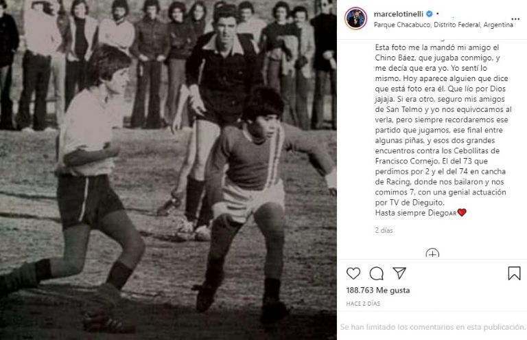 Marcelo Tinelli,subió a su Instagram una instantánea en blanco y negro donde, supuestamente, se lo puede ver a él junto a Maradona jugando al fútbol en su juventud. "Parque Chacabuco. Año 1973. Yo jugaba en San Telmo. Me dijeron que en Los Cebollitas (Arg.Jrs), había uno que le decían Pelusa y jugaba muy bien. Se quedaron cortos. Hasta siempre Diego", escribió en la publicación el presidente de San Lorenzo.