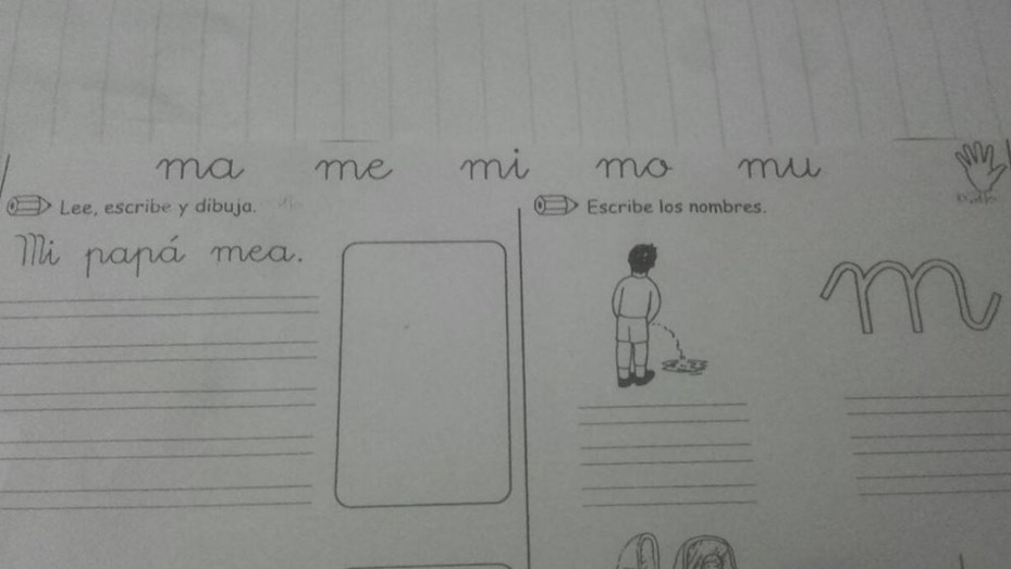 "Mi mamá muele" y "Mi papá mea" fueron las oraciones que puso la maestra en el ejercicio para que los chicos identifiquen la consonante y dibujen la acción.