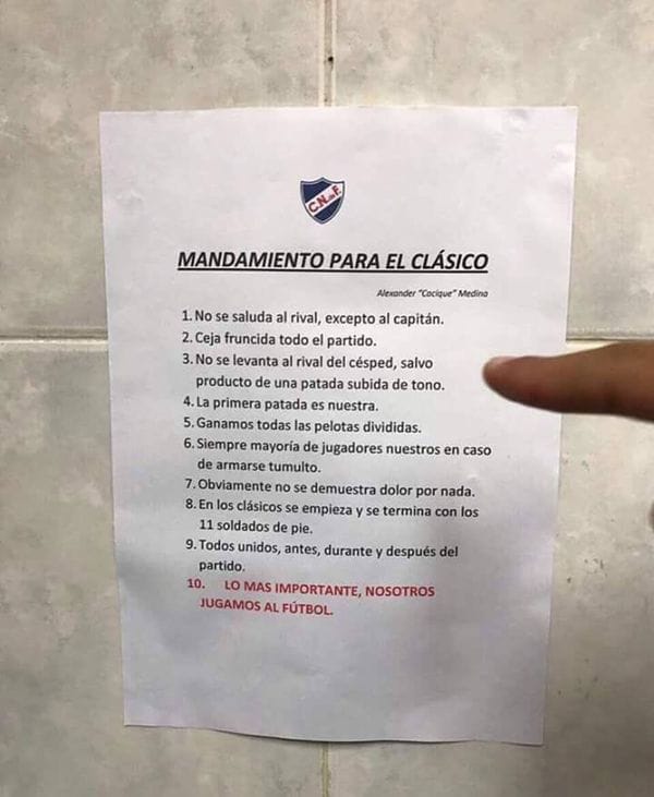 La imagen del controvertido decálogo, aparentemente pegado en la pared del vestuario y titulado "Mandamiento para el clásico", se viralizó en las redes sociales y abrió el debate. "No se saluda al rival", "No se levanta al rival del césped" y "La primera patada es nuestra", eran algunas de las discutidas instrucciones.