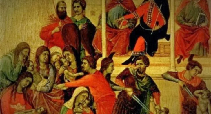 Según San Mateo, Herodes el Grande, obsesionado con el poder y por el temor a perderlo, al enterarse que había nacido un nuevo rey ordenó que le dieran muerte inmediatamente.