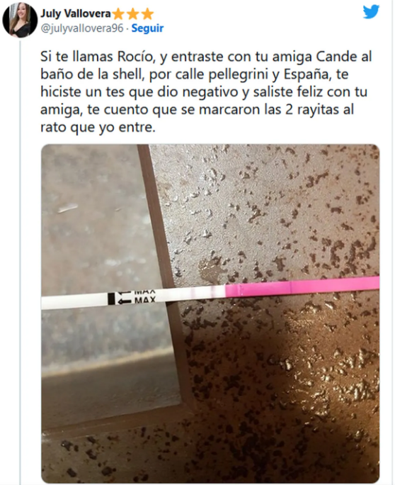 "Si te llamas Rocío y entraste con tu amiga Cande al baño de la Shell, por calle Pellegrini y España, te hiciste un test que dio negativo y saliste feliz con tu amiga, te cuento que se marcaron las dos rayitas al rato que yo entré", escribió "July" en su cuenta.