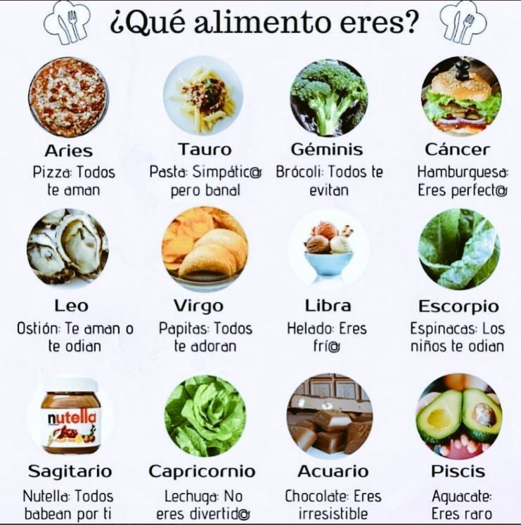 Los nacidos bajo la influencia de Tauro “son” pastas ya que los considera “simpáticos pero banales”, los de Leo son ostras y las demás personas “te aman o te odian”. Lo más dulce queda reservado para Libra (helado), Sagitario (nutella) y Acuario (Chocolate).