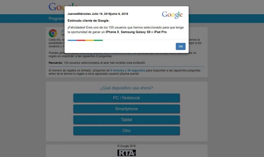 “Estimado cliente de Google: ¡Felicidades! Eres uno de los 100 usuarios que hemos seleccionado para que tenga la oportunidad de ganar un iPhone X, Samsung Galaxy S9 o iPad Pro”, indica el mensaje que alertó a los usuarios.
