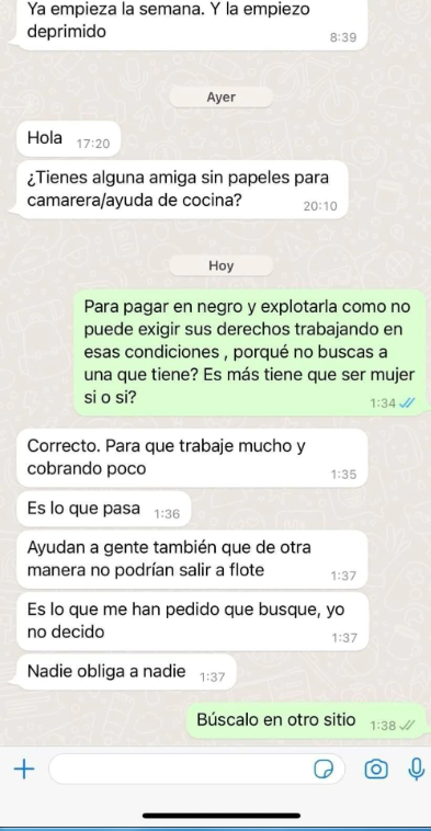 La conversación comienza con una frase que generó mucha indignación tanto en quien leía como en quienes lo compartieron en las redes sociales. “Hola, ¿tienes alguna amiga sin papeles para camarera/ayuda de cocina?”, fue la frase que, en pocas palabras, indicó tanto las condiciones laborales como los requisitos para formar parte del equipo.
