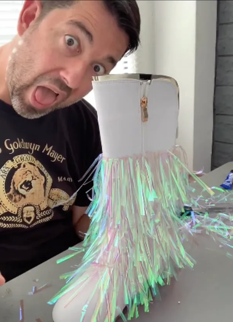 En el videoclip, el influencer y bloguero, explicó que tuvo que pedir las botas a China ya que por el tamaño no era sencillo conseguirlas. Le tardaron un mes en llegar. Manuel mostró que tuvo que cortar unas tiras de listón tornasolado y pegarlas una por una hasta lograr el mismo efecto que las preciadas botas de la famosa cantante.