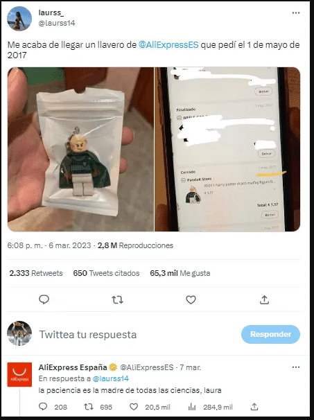 Sin embargo, lo más divertido del caso es que a la publicación que hizo en Twitter @laurss14 se la contestó la filial de España de la tienda AliExpress, con una burla insólita.