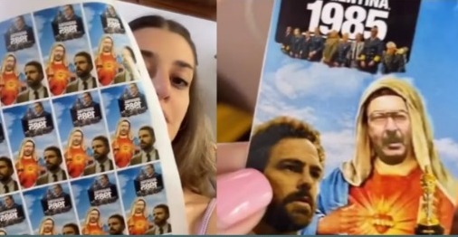 “Antes de cada partido de la Selección salía a repartir estas estampitas de Messi a quienes tenían la camiseta puesta. Hoy estamos a 10 días de que sean los Oscar y tenemos que ganar el tercero. Asi que hice estampitas de ‘Argentina,1985′ y las voy a salir a repartir”, sostuvo la influencer Juliana Bistacco.