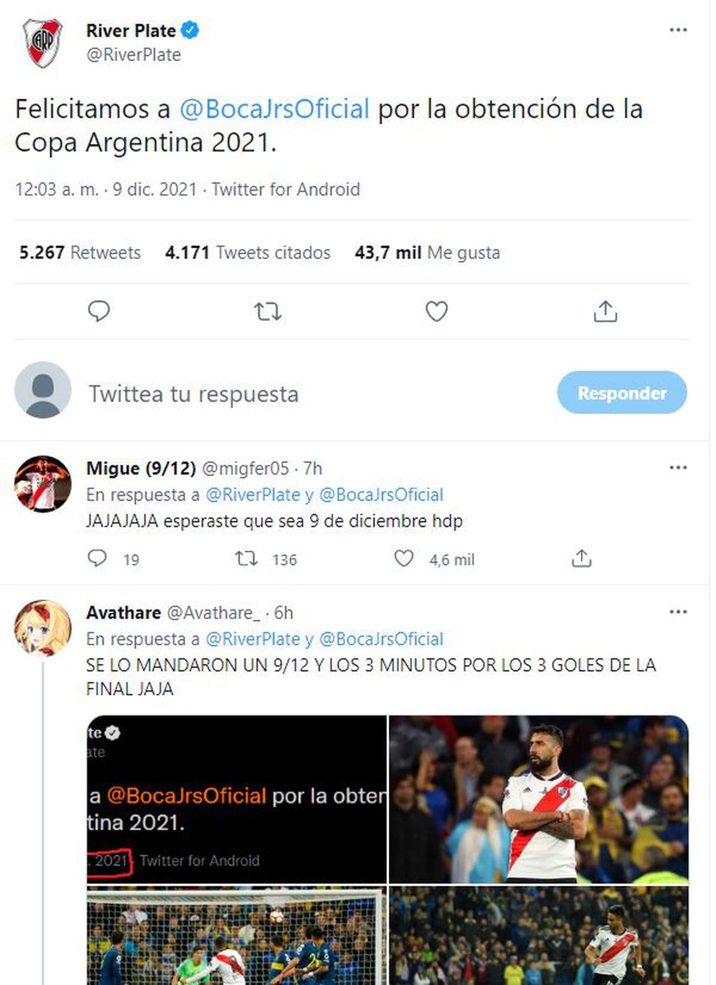 “jajajaj esperaron que sea 9 de diciembre para mandar el tuit”, “Se lo mandaron un 9/12 y los 3 minutos por los tres goles de la final, jajaajaja”, fue