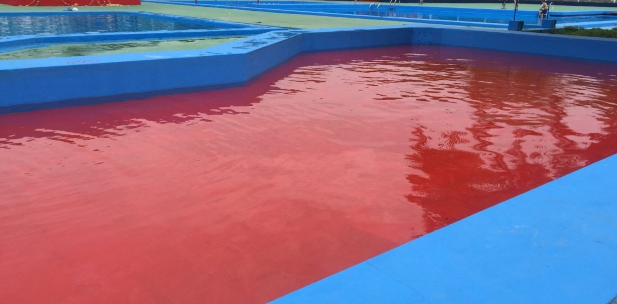 Una de las piletas del complejo (avenida Fernández de la Cruz 2145, Flores) fue pintada con los colores de la institución: utilizaron el azul para los bordes y el rojo para el fondo, lo que da la impresión de agua color "sangre".