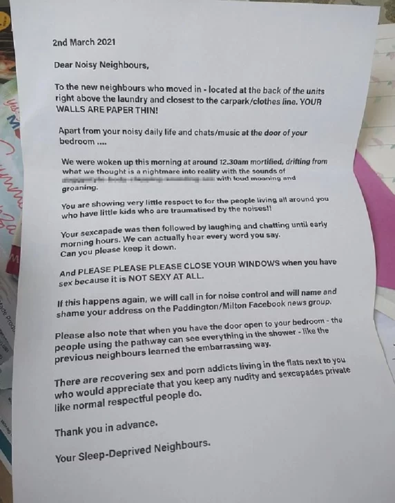 El hecho ocurrió en una residencia de Brisbane, Australia. Una mujer se cansó de que sus nuevos vecinos hagan mucho ruido a la noche. La carta se volvió viral rápidamente después de ser compartida en Reddit. “Nos despertaron esta mañana alrededor de las 12.30 am mortificados, pasando de lo que pensábamos que era una pesadilla a la realidad con los sonidos de fuertes gemidos“, comenzó la nota.