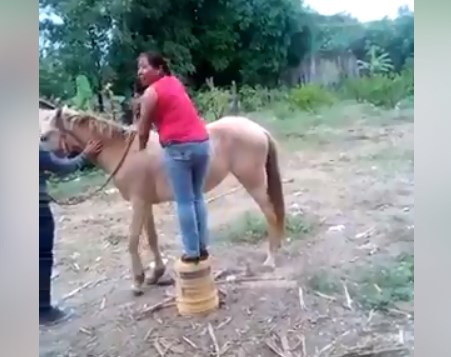Sin embargo, a lo largo del material se escucha a la persona que grabó el momento incentivar a la mujer a que termine sobre el lomo del equino.