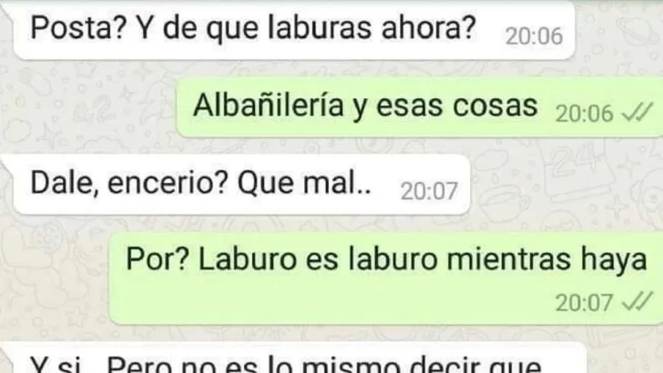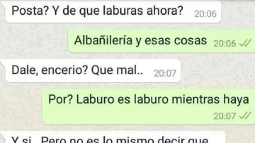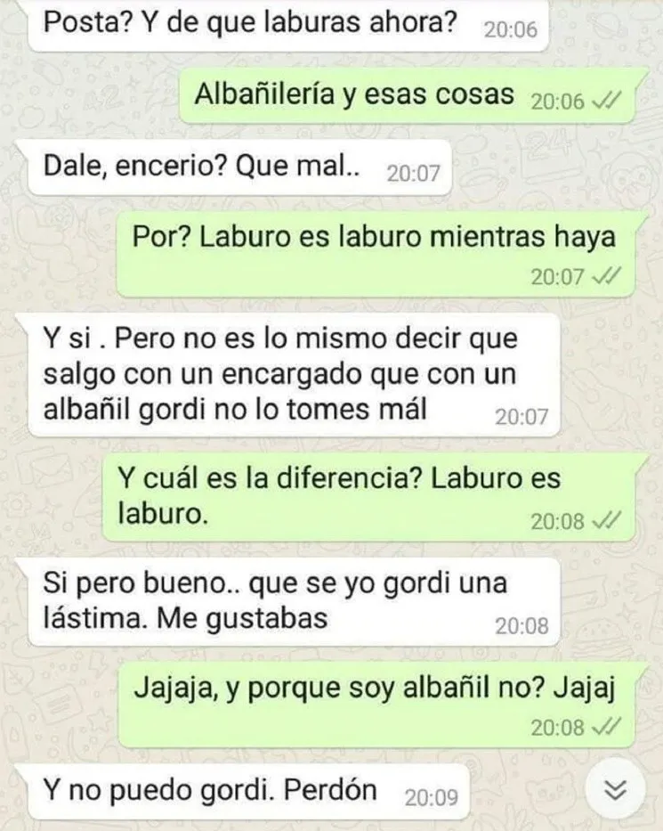 "Posta? Y de qué laburás ahora?", le preguntó ella y él le dijo que se dedica a la "albañilería y esas cosas". En ese momento, inentendiblemente, lo cuestionó, con algunas faltas de ortografía en el medio: "Dale, encerio? (sic) que mal..". Y luego agregó: "No es lo mismo decir que salgo con un encargado que con un albañil gordi, no te lo tomes a mal".