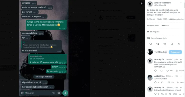 “Le digo que se murió mi abuela y me tantea a qué hora es el velorio para ver si llego. Increíble”, manifestó al publicar la conversación en la que le preguntaban si la ceremonia “era a la mañana” debido a que el partido comenzaba a las 19.