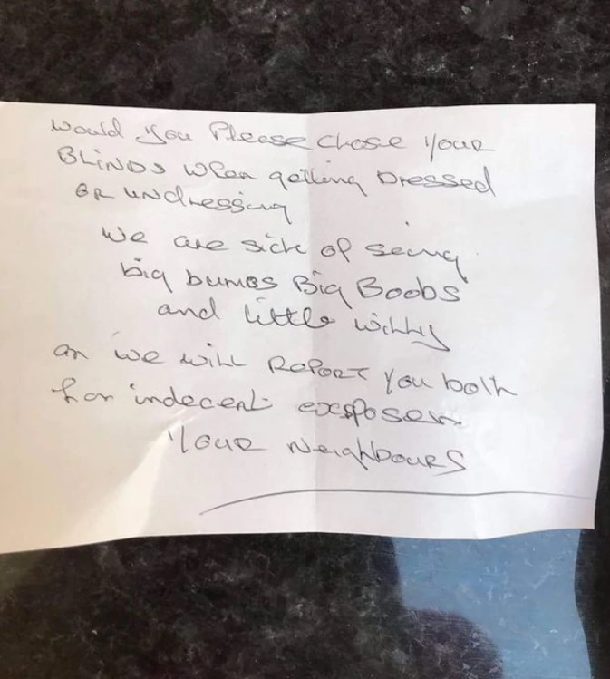 "¿Podrían por favor cerrar las persianas mientras se visten o desvisten?", comenzaba la carta que sorprendió a la pareja inglesa. Y continuaba: "Estamos hartos de ver cola grande, senos grandes y un pene chiquito… y los demandaremos por exposición indecente". La nota llevaba una firma: "Sus vecinos".