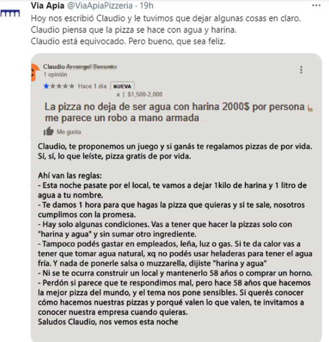 En Twitter, el local gastronómico advirtió: “Hoy nos escribió Claudio y le tuvimos que dejar algunas cosas en claro. Claudio piensa que la pizza se hace con agua y harina. Claudio está equivocado. Pero bueno, que sea feliz”.