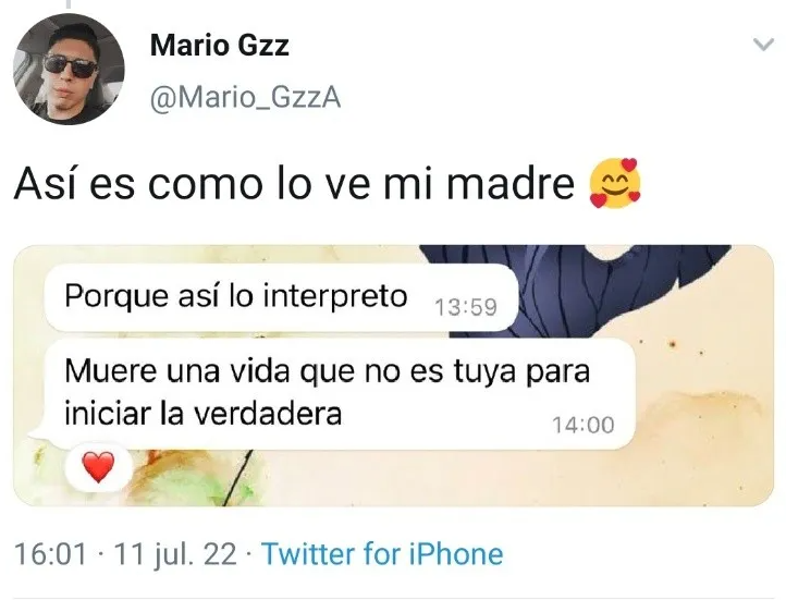 Ante algunos cuestionamientos de usuarios que se metieron con el diseño elegido por la mamá de Mario para demostrarle su apoyo incondicional, él subió a la red otra parte de la conversación donde la mujer le dio una explicación muy sencilla al respecto: “Así lo interpreto. Muere una vida que no es tuya para iniciar la verdadera”, dijo la mujer. “¿Puedo amar más a tu mamá? No la conozco, no te conozco, pero ya los amo”. “Se me metió algo en el ojo. Qué dulce tu mamá”, sumaron los usuarios.