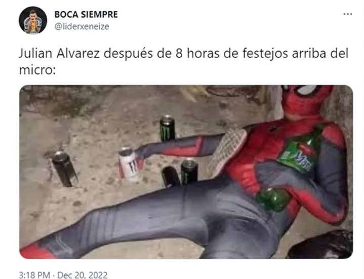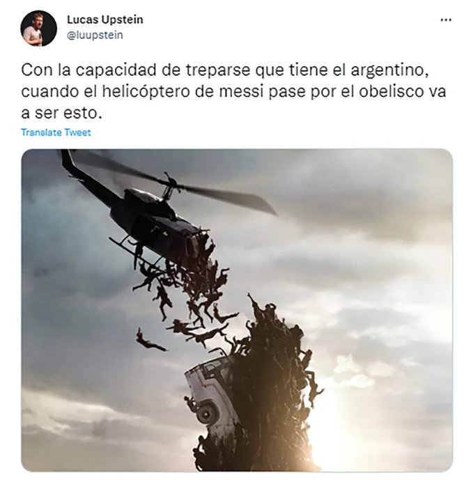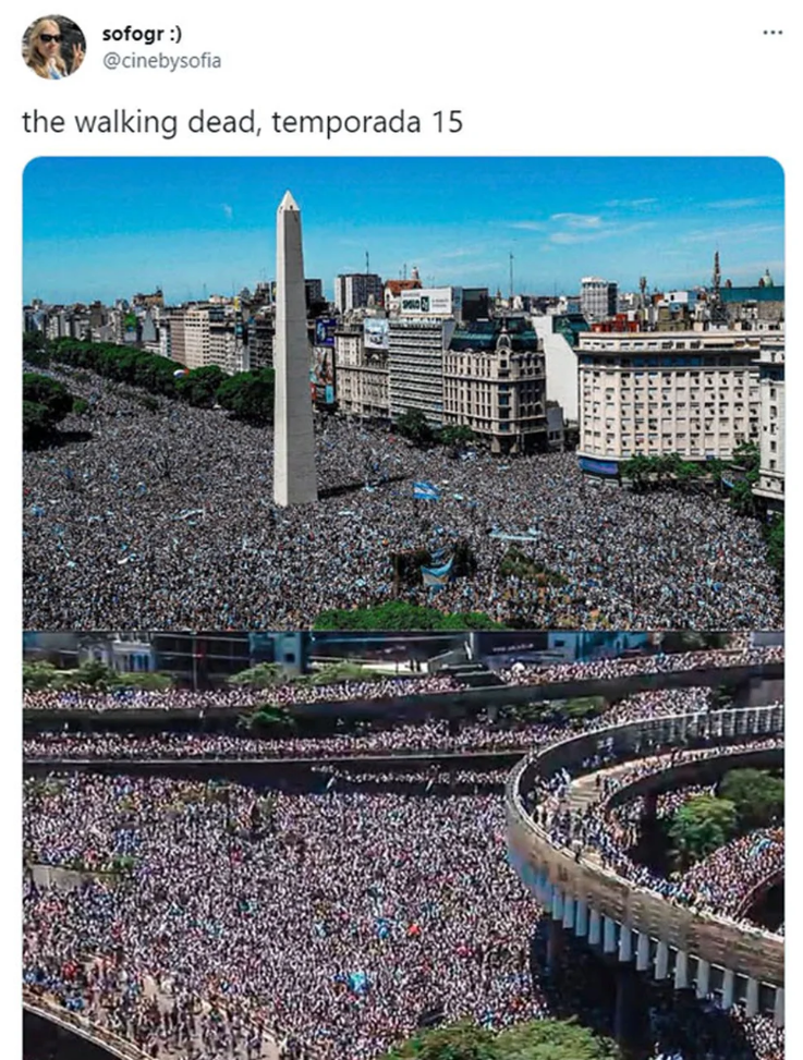 Primero, muchos apuntaron sus bromas al bronceado que iban a tener los jugadores en el bus ya que luego de dos horas apenas había avanzado un par de kilómetros por Riccheri y luego iniciaron las bromas sobre The Walking Dead. Es que mientras la caravana de los campeones se acercaba al Mercado Central, los millones que s habían congregado en el Obelisco iniciaron su marcha rumbo a la autopista 25 de mayo, al anoticiarse sobre que el vehículo no iba a tomar la Avenida 9 de Julio.