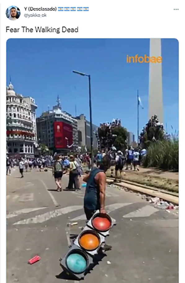 La escena de las miles de almas avanzando sobre la autopista hizo que muchos comparen la escena con la popular serie de zombies. Sobre todo cuando algunas personas saltaron sobre un camión para festejar sobre él y cantar por la Selección, que aún estaba lejos de llegar a destino.