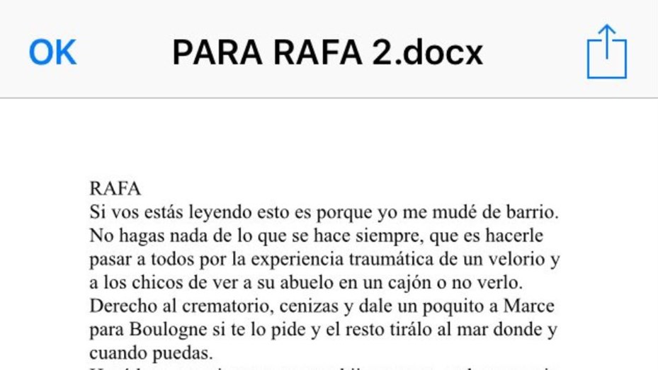 "Hacé lo necesario para que tus hijos tengan en la memoria a su abuelo, que es la forma de seguir vivo. Lo estaré mientras me mantenga en el recuerdo de mis hijos e nietos, como yo tengo a mis abuelos en la memoria y el corazón", continúa el texto que estaba escondido dentro de la computadora de Antonio, y que Rafael logró encontrar gracias a que le dejó un "caminito de migas".