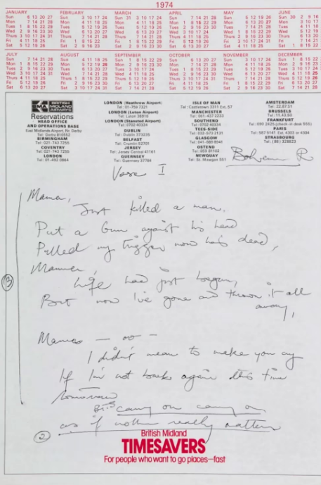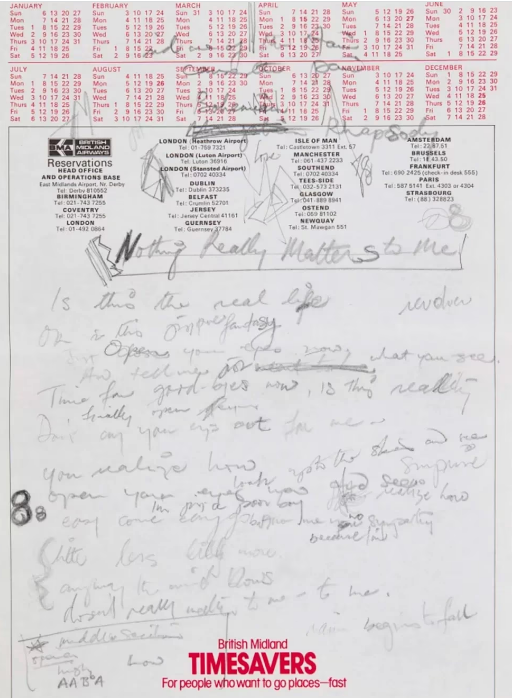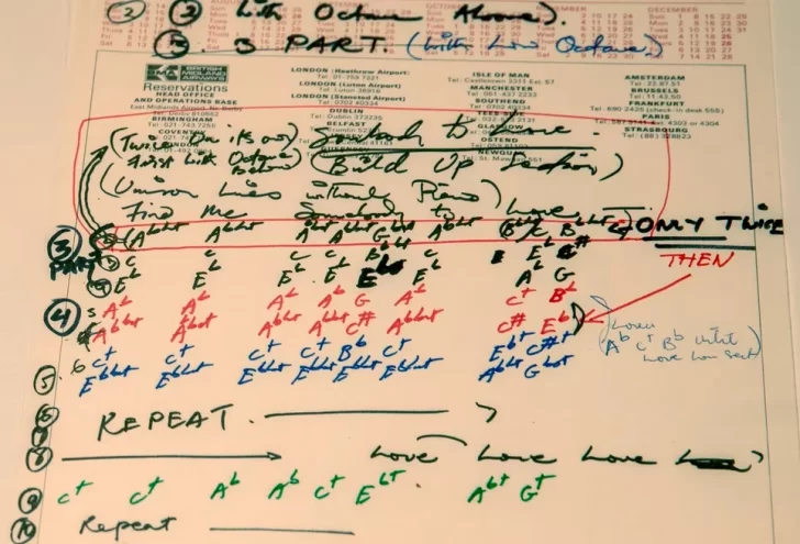Entre los escritos destaca un borrador de 15 páginas escrito con bolígrafo y lápiz en hojas de una -ya inexistente- aerolínea, British Midlands Airways, que revela los múltiples giros que Mercury consideró durante la composición del éxito “Bohemian Rhapsody”.