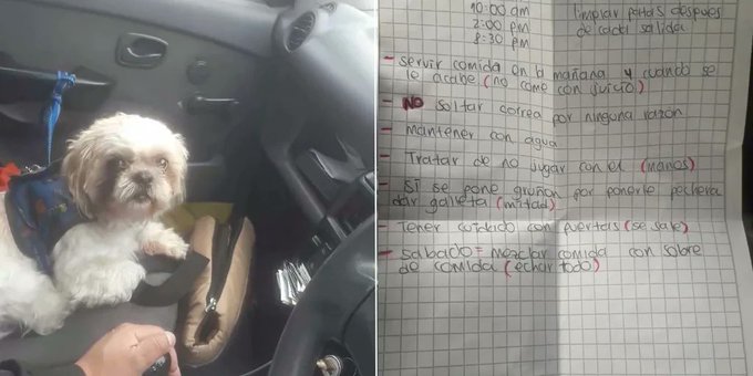 Con la intención de encontrar un nuevo hogar para el animal, compartió este video en sus perfiles de las redes y destacó que, además, le dejaron una carta con una serie de instrucciones: “Servir comida en la mañana y cuando se le acabe. No soltar la correa por ninguna razón. Darle agua, tratar de no jugar con él. Sí se pone gruñón por ponerle la pechera, ofrecerle galletas. Tener cuidado con las puertas. Mezclarle la comida”.
