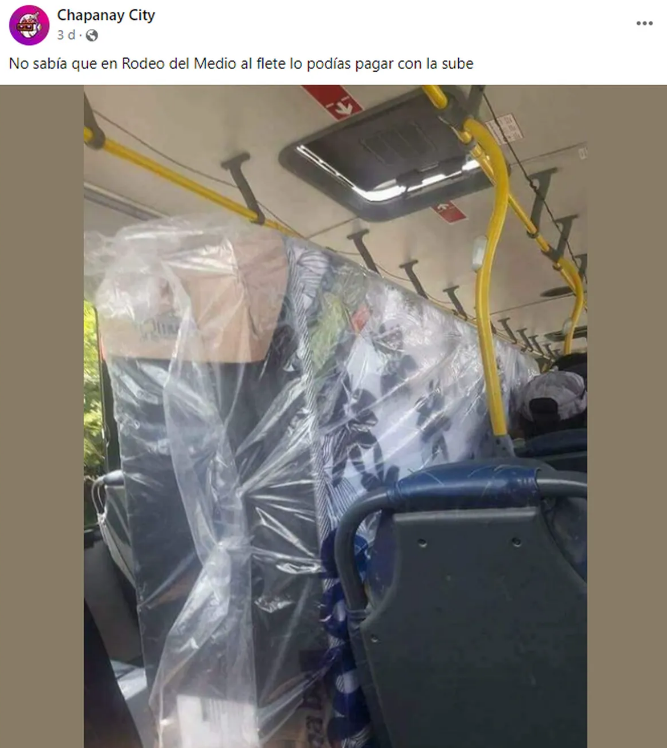 Gracias a una publicación que estalló en Facebook y se hizo viral entre los usuarios, los creadores de la cuenta Chapanay City tentaron a la comunidad tras mostrar el particular viaje. En la foto se ve que otro de los pasajeros había cargado un colchón que cortaba todo el pasillo: "Si podés comprar ese colchón podés pagar un flete".