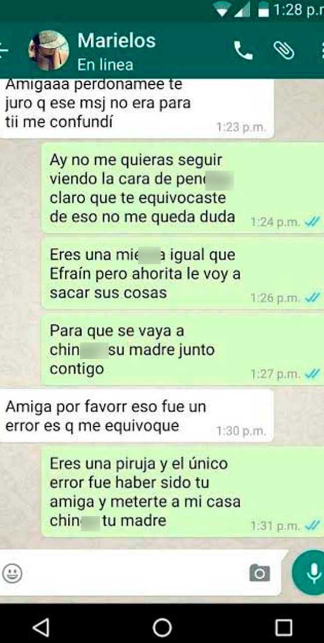 La amiga solo le quedó disculparse en reiteradas oportunidades pero no le creyó. De esta manera, la afectada solo tuvo palabras soezas para la ‘tracionera amistad’. Insólita conversación se viralizó en WhatsApp.