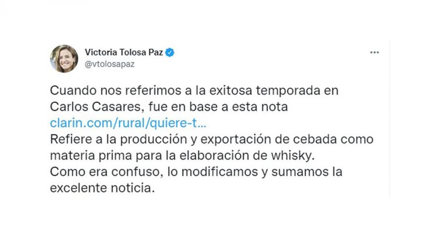 A continuación, la diputada del Frente de Todos señaló que la nota “refiere a la producción y exportación de cebada como materia prima para la elaboración de whisky” y aclaró: “Como era confuso, lo modificamos y sumamos la excelente noticia”.