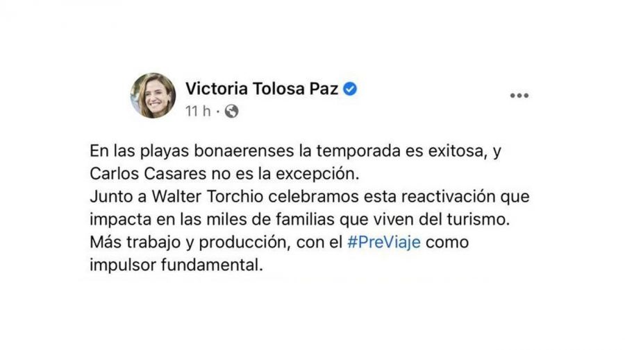 “En las playas bonaerenses la temporada es exitosa y Carlos Casares no es la excepción”, posteó Tolosa Paz dando a entender que la localidad bonaerense, que se encuentra ubicada a 550 kilómetros de Mar del Plata, también pertenece a La Costa.