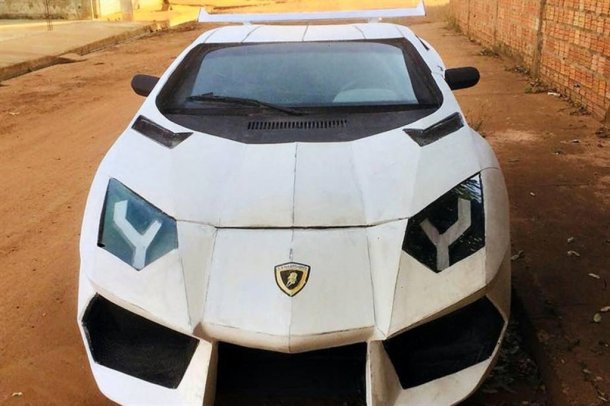 Tras definir el boceto y el plan de transformación, lo primero que hizo fue cortar el pilar A (el parante delantero) y bajar el techo. Asegura que en el proceso utilizó materiales baratos, livianos y maleables. Pasó noches enteras entre chapas de aluminio, espuma de poliestireno, casi 500 kilos de masa acrílica y amigos que se dispusieron a ayudarlo. Uno de ellos compró una miniatura del Aventador para guiarse mejor y otros donaron parte del material.