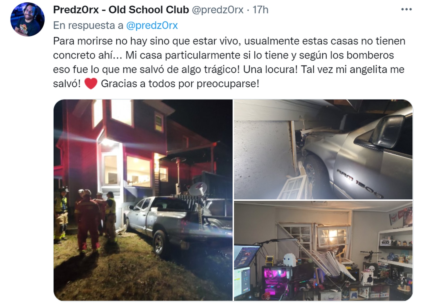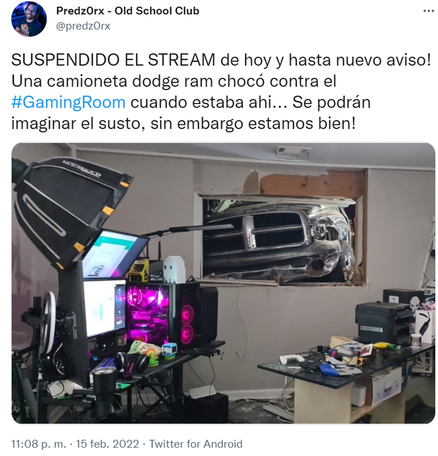 A través de su perfil de Twitter @Predz0rx – Old School Club, el streamer publicó una foto del accidente con el siguiente mensaje: “SUSPENDIDO EL STREAM de hoy y hasta nuevo aviso! Una camioneta dodge ram chocó contra el #GamingRoom cuando estaba ahi… Se podrán imaginar el susto, sin embargo estamos bien!”