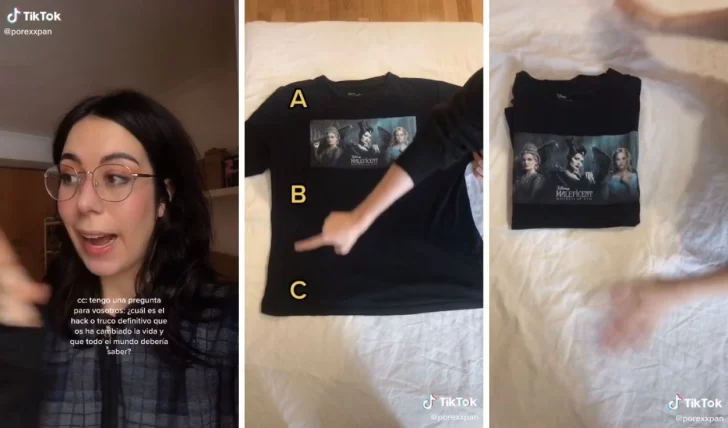 Es entonces que la joven decide mostrar el suyo. Así enseña cómo, al separar una camiseta en tres puntos imaginarios, puede dar perfectamente doblada con solo tres movimientos. Este práctico truco ya es viral en TikTok.