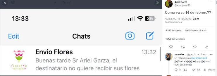 “Buenas tardes Sr Ariel Garza, el destinatario no quiere recibir sus flores”, fue el mensaje que recibió y decidió compartir en su cuenta de Twitter, que obtuvo más de 100 mil “Me Gusta” y más de 3 millones y medio de visualizaciones.