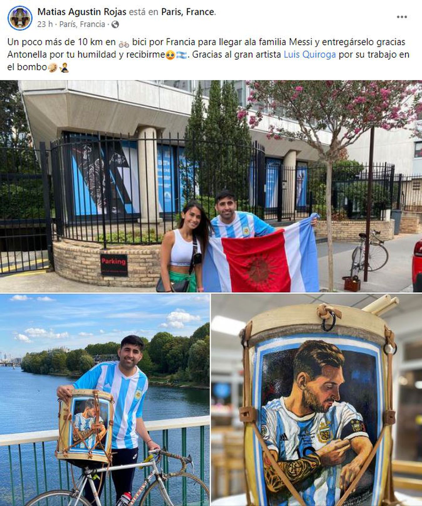 “Un poco más de 10 km en bici por Francia para llegar a la familia Messi y entregárselo. Gracias Antonella por tu humildad y recibirme. Gracias al gran artista Luis Quiroga por su trabajo en el bombo”, escribió Matías Agustín Rojas en su cuenta de Facebook donde tiene cientos de comentarios e interacciones de parte de mucha de la gente que lo conoce, sobre todo de Loreto, donde nació, pero también de decenas y decenas de desconocidos que le transmiten su orugullo por lo que hizo.