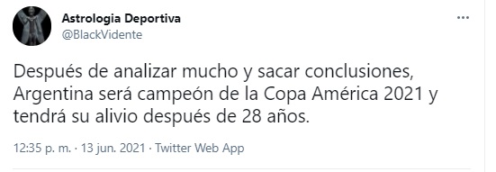 “Después de analizar mucho y sacar conclusiones, Argentina será campeón de la Copa América 2021 y tendrá su alivio después de 28 años”, escribió en su cuenta de la red social que se hace llamar “Astrología Deportiva”.
