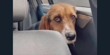 En el comienzo del TikTok, se puede ver al perrito el día que lo adoptaron. Kelly lo puso en el asiento trasero del auto, y él apenas la miraba a los ojos. De hecho, sus orejas estaban caídas y en la cara tenía un gesto de desánimo.