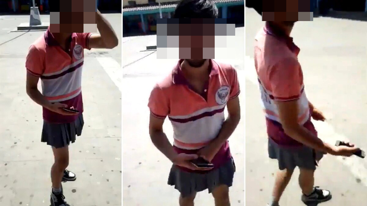 El insólito suceso ocurrió en el colegio Mariano Moreno. El joven con falda protagonizó un video que se viralizó. “Con pantalón corto no nos dejan venir así que vengo con pollera”, cuenta en la grabación.