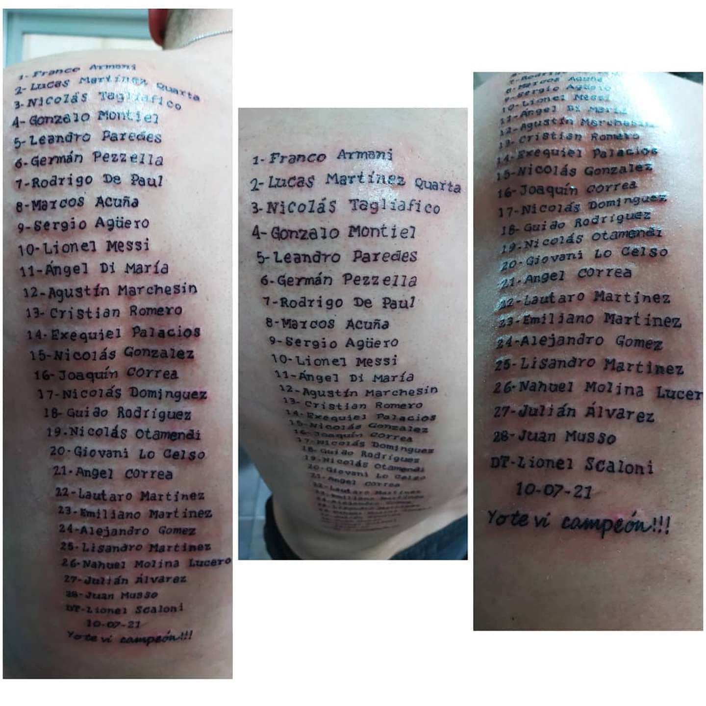 Un claro ejemplo de esto es lo que hizo un cordobés llamado Marcos Armando, que tuvo la original idea de tatuarse todos los nombres del plantel campeón en su espalda. Además, también le agregó la fecha (10-07-21) y la frase: “Yo te vi campeón!”.