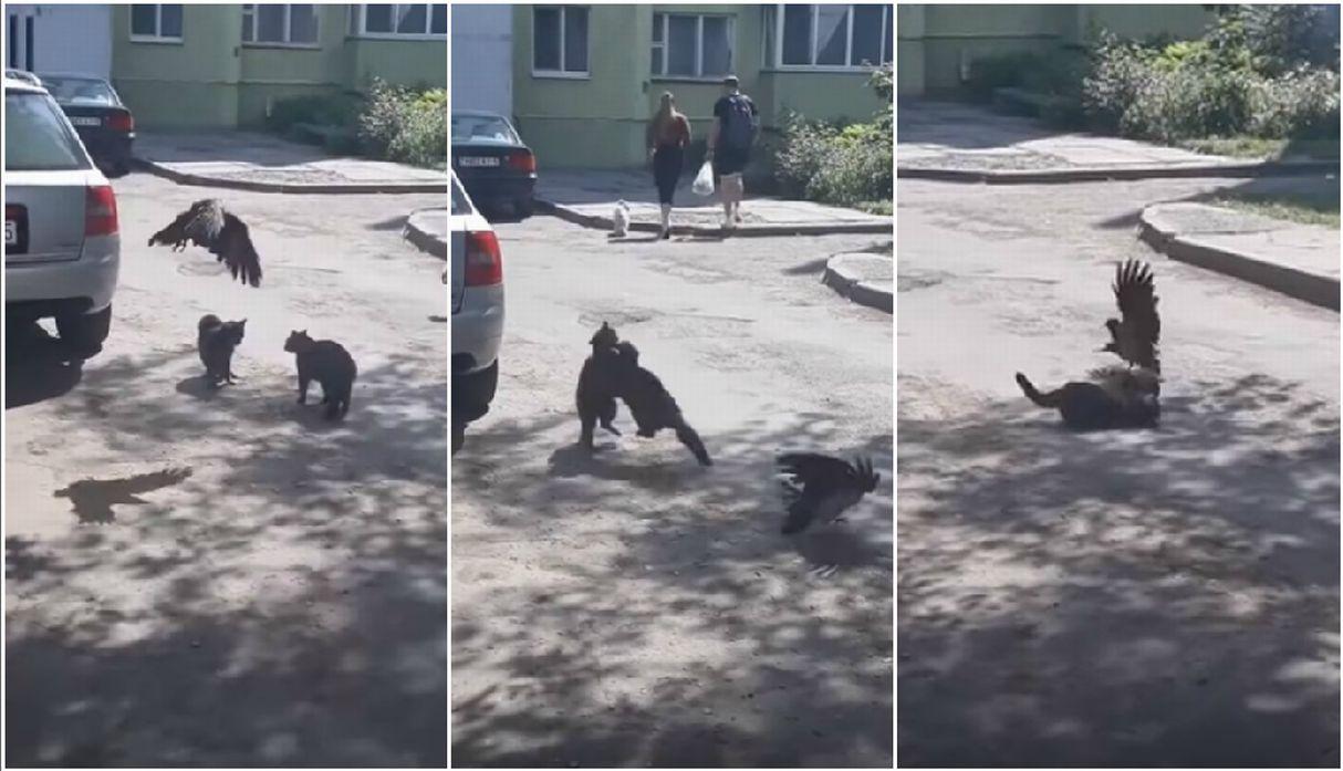 De acuerdo a las imágenes compartidas en la red social, el cuervo se percató que dos gatos se miraban fijamente con la intención de hacerse daño en el patio de un edificio residencial en una ciudad rusa.