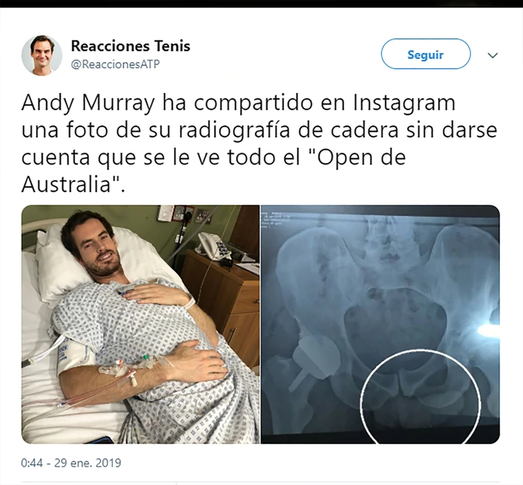Murray compartió inocentemente la radiografía de su cadera tras someterse a una operación. Lo que no advirtió el bicampeón de Wimbledon (2013, 2016) fue que dicha placa dejaba al descubierto la imagen de su pene.