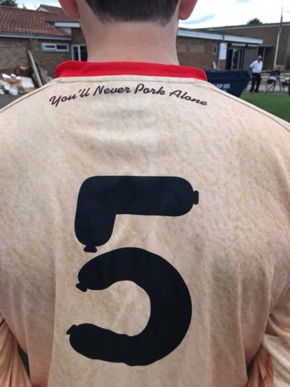 El toque especial que tienen las casacas viene en el dorso, donde además de un número que combina con la temática, aparece la frase "You’ll never pork alone", parodiando al famoso canto de los hinchas del Liverpool "You’ll never walk alone".